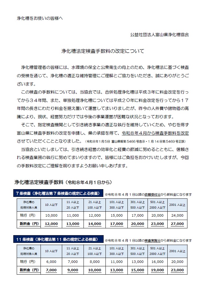 令和8年1月5日付の富山県報において、浄化槽法定検査手数料の改定が承認され告示されました。